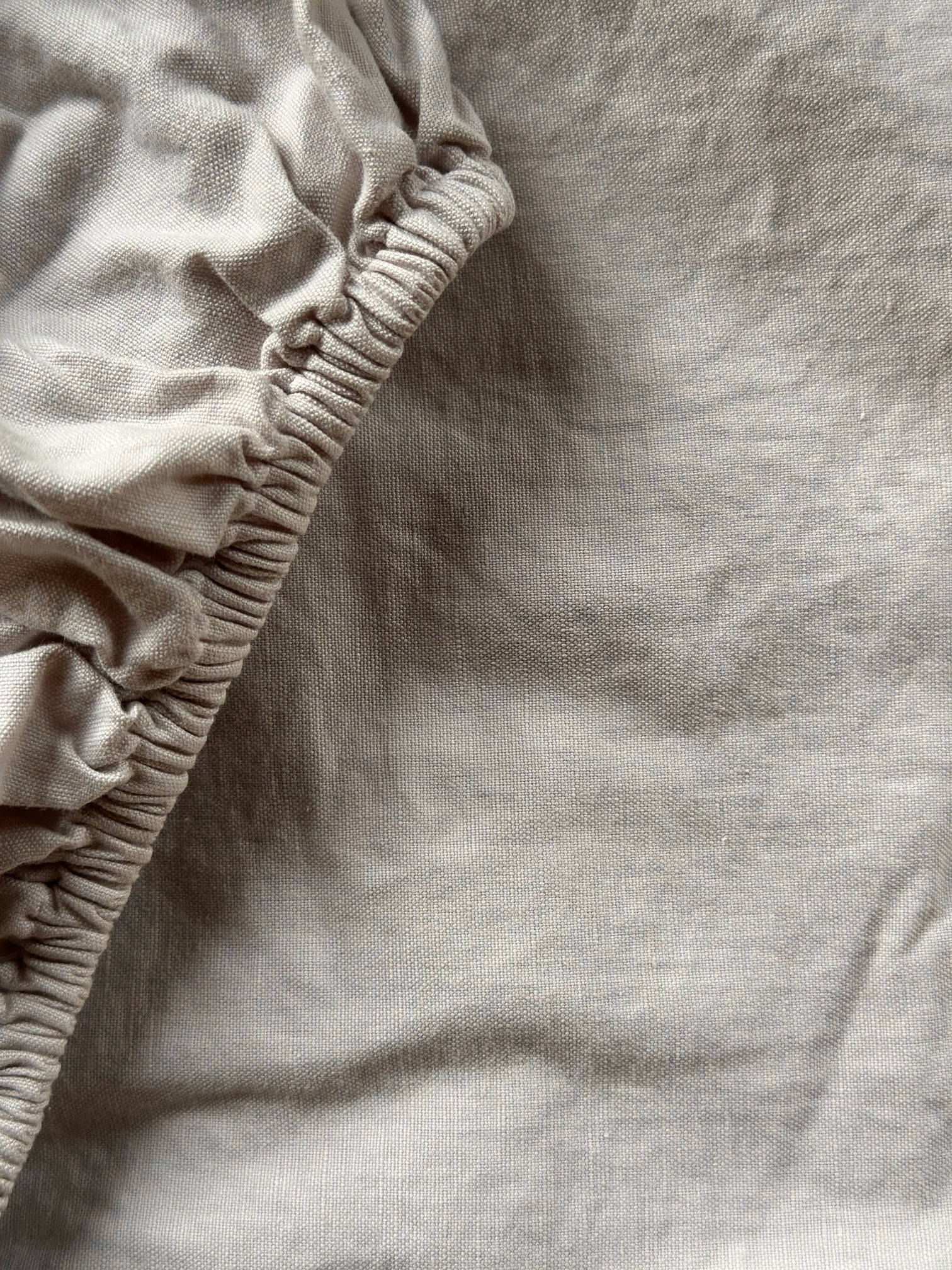 Découvrez notre drap-housse en lin lavé et coton lavé, coloris beige ficelle, avec un bonnet de 30 cm, adapté aux matelas épais.