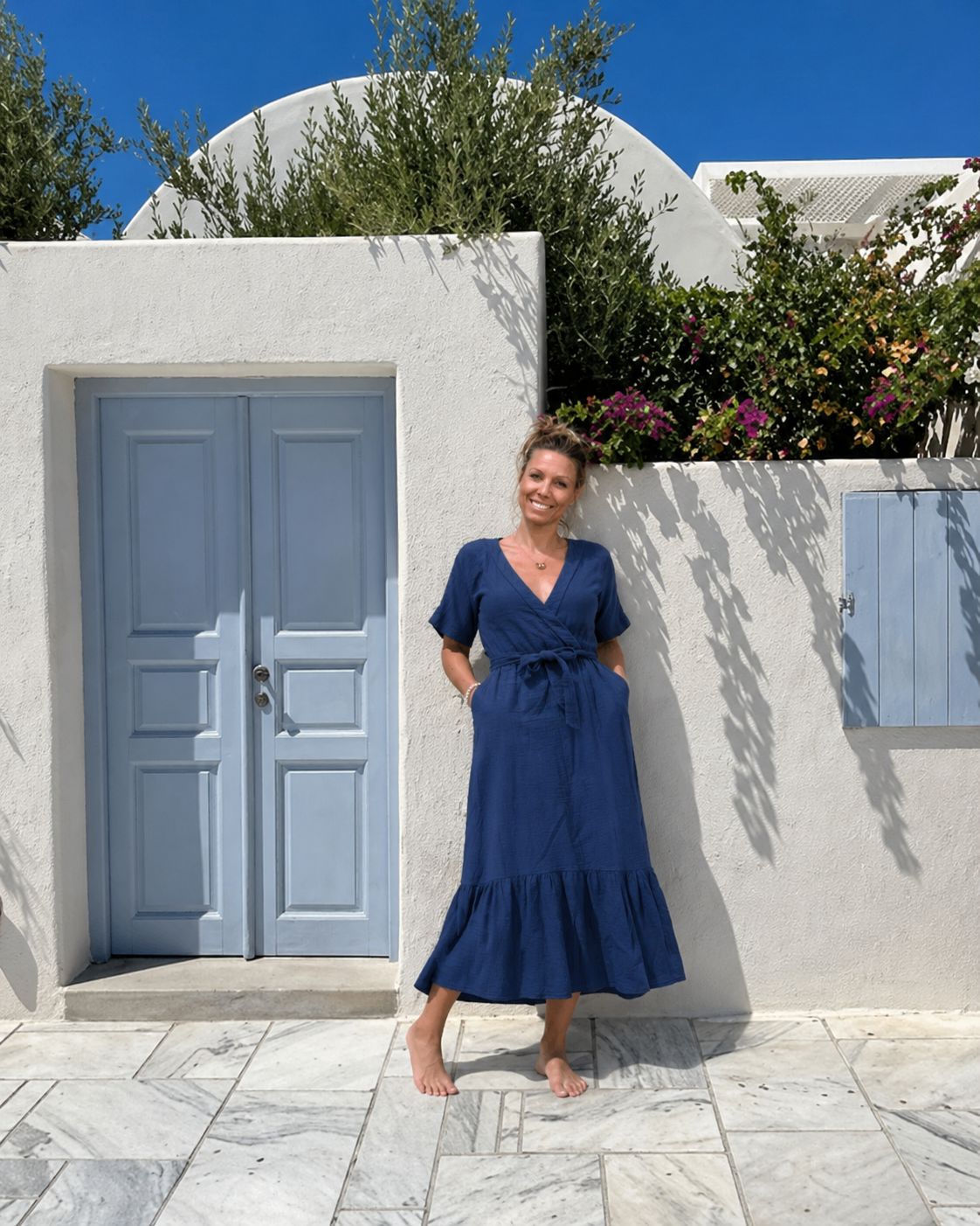 Cette robe made in France met en valeur la silhouette grâce à sa coupe féminine, son joli décolleté croisé, sa taille soulignée par une ceinture à nouer et sa longueur midi très élégante. Son volume ample et sa finition volantée en bas apportent une touche de décontraction tout en restant sophistiquée. C’est une pièce que l’on aime porter pieds nus en vacances, avec des sandales en ville ou accessoirisée pour une occasion plus habillée.